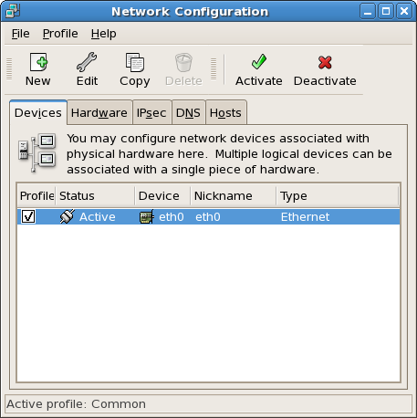 Configure the usual network items, and then click OK. The Ethernet Device tool closes, and you are returned to the Network Configuration tool. On the Network Configuration tool, select the DNS tab.